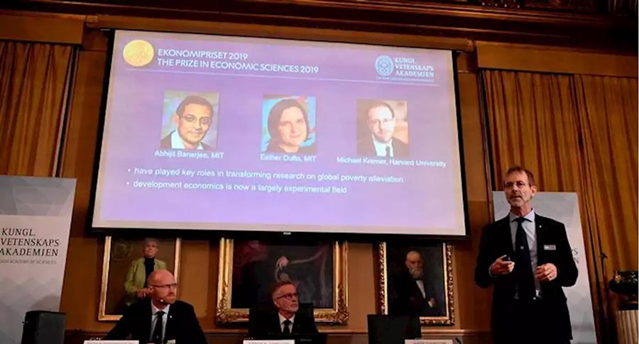 منحت الأكاديمية الملكية السويدية للعلوم جائزة نوبل في الاقتصاد للأمريكيين أبهجيت بانيرجي ذو الأصول الهندية وإستر دوفلو ذات الأصول الفرنسية والأمريكي مايكل كريمر عن أبحاثهم وأعمالهم في مجال محاربة الفقر في العالم. وتعد إستر دوفلو ثاني امرأة تفوز بجائزة نوبل للاقتصاد في تاريخ هذه المكافأة. وتتمثل الجائزة في ميدالية ذهبية ودبلوم وشيك بقيمة تسعة ملايين كورون سويدي.