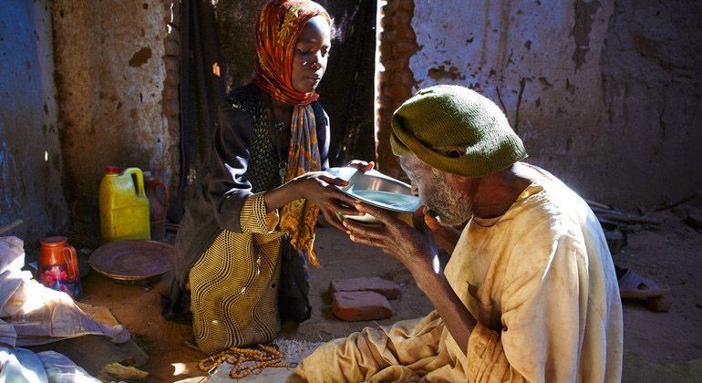 طفلة تقدم الماء لجدها بعد صلاته في مخيم للنازحين في دارفور