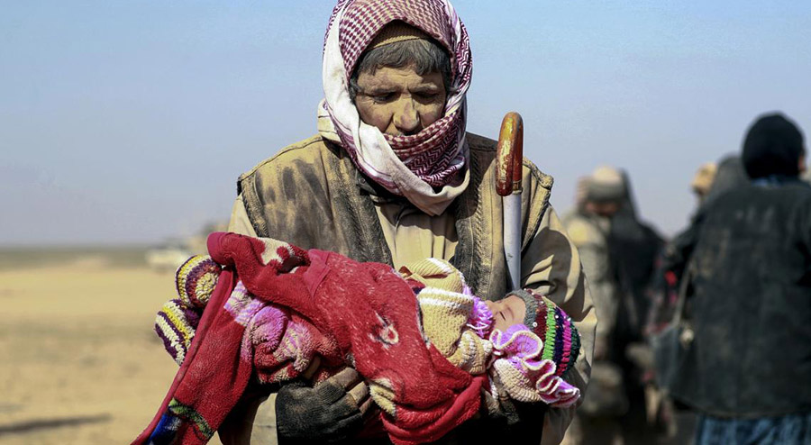 رجل يحمل طفلاً صغيراً بالقرب من قرية بغوز في منطقة حاجين شرقي سوريا