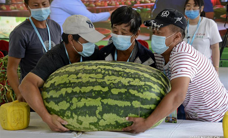 عمال يحملون بطيخة ضخمة تزن 86.3 كيلوغرام، في الدورة الـ32 لمسابقة البطيخ الوطنية المقامة في حي داشينغ ببكين.