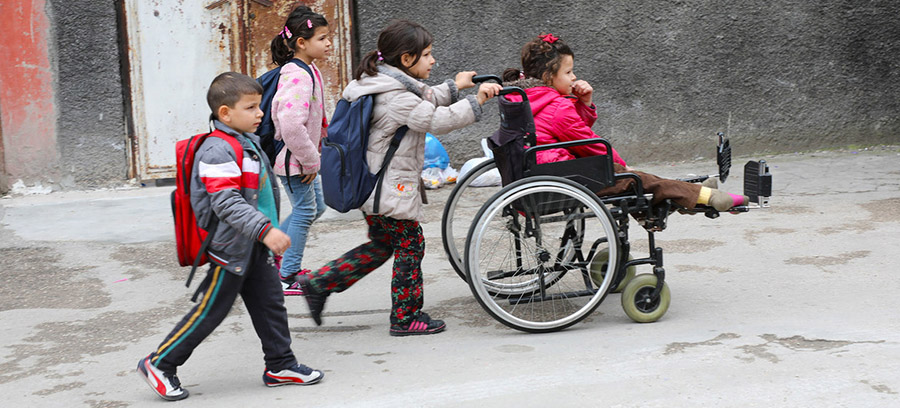 طفلة لاجئة من ذوي الإعاقة تجلس على كرسي متحرك تساعدها أختها بينما تتوجه هي وأشقاؤها إلى المدرسة في أضنة، تركيا.