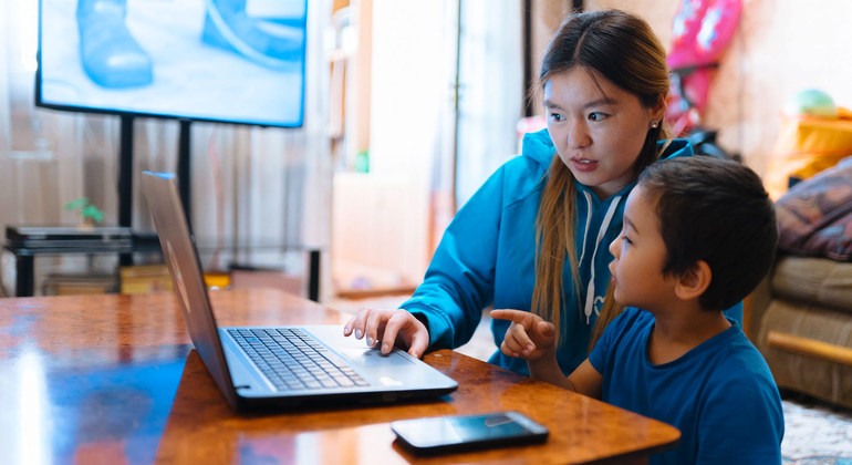 يستفيد الأطفال من ذوي الإعاقة في قيرغيزستان من عمل متطوعي اليونيسف. هنا، تقوم متطوعة بكتابة الدروس مع ابن أخيها في المنزل.