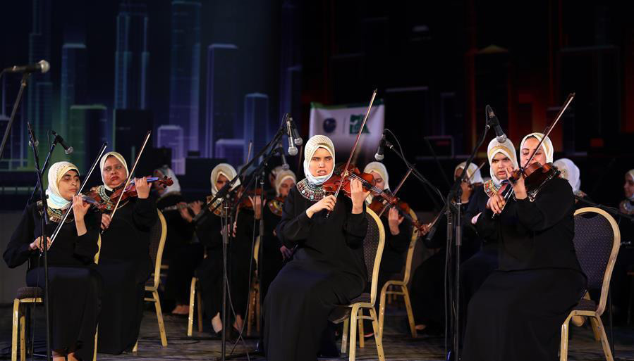 في الصورة الملتقطة يوم 7 أكتوبر 2020، موسيقيات يعانين من إعاقة بصرية يعزفن عشية يوم الأبصار العالمي في دار الأوبرا المصرية في القاهرة، مصر. يقام يوم الأبصار العالمي في الخميس الثاني من أكتوبر كل عام، ويهدف لتركيز الانتباه العالمي على الإعاقة البصرية والعمى.