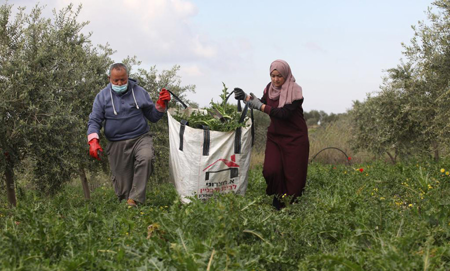 المزارع الفلسطيني زياد صوان وابنته رنا يجمعان نبات العكوب ( جونديليا) في مزرعته بقرية إيماتين بمدينة قلقيلية بالضفة الغربية.