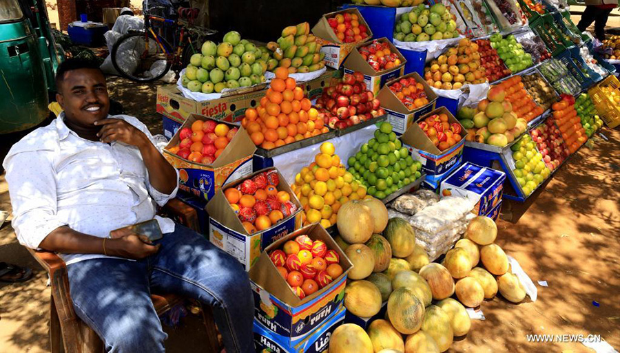 بائع فواكه يعرض بضاعته لتلبية حاجات الزبائن في شهر رمضان المبارك في الخرطوم، السودان.