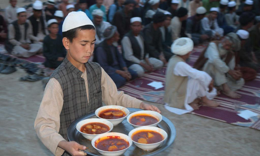 توزيع الطعام قبل الإفطار للفقراء في منطقة خواجا دو كوه بمقاطعة جوزجان بأفغانستان، حيث تعد مجموعة من رجال الأعمال طعام الإفطار للمسلمين خلال شهر رمضان.