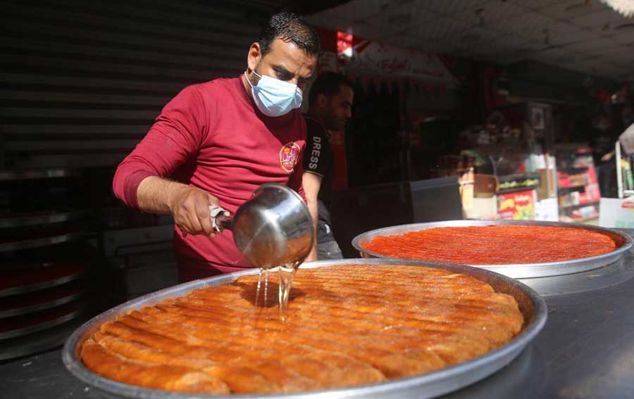 بائع فلسطيني يصنع حلوى تقليدية في سوق خلال شهر رمضان الكريم في مدينة رفح جنوبي قطاع غزة.