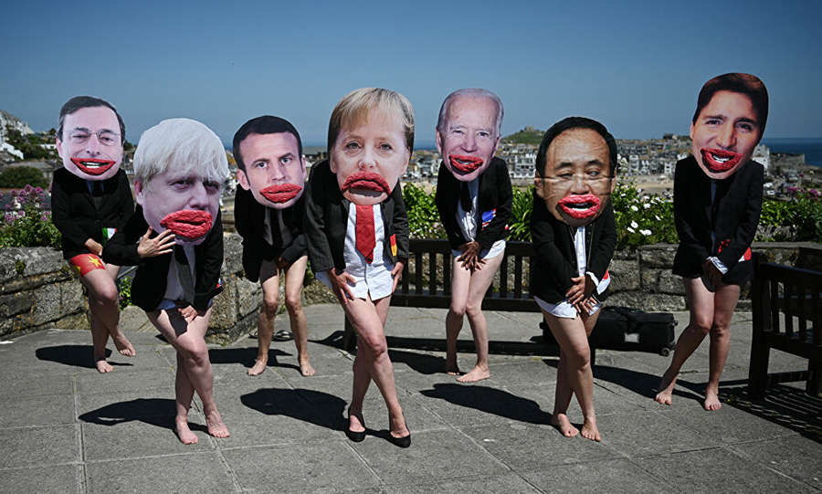 نشطاء بيئيون من حركة "تمرد الانقراض" يقفون مرتدين أقنعة لوجوه قادة مجموعة السبع في فعالية احتجاجية لتسليط الضوء على عدم المساواة بين الجنسين في السياسة في سانت إيفز، كورنوال خلال قمة مجموعة السبع.