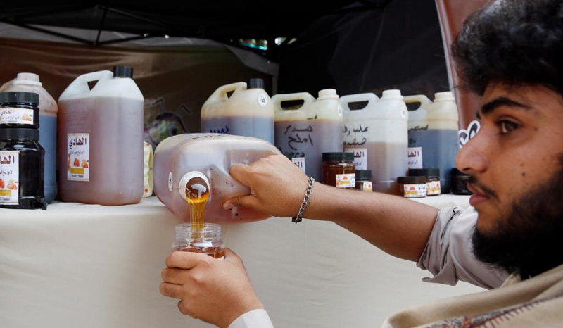بائع يعرض منتجاته من العسل في مهرجان للعسل في صنعاء- اليمن.