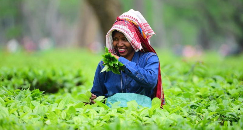 مزارعة تقطف أوراق الشاي في حديقة شاي في ناحية ناجاون بولاية آسام شمال شرقي الهند.
