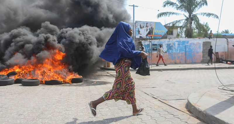 امرأة تجري بالقرب من العجلات المشتعلة أثناء الاحتجاجات في بينين.