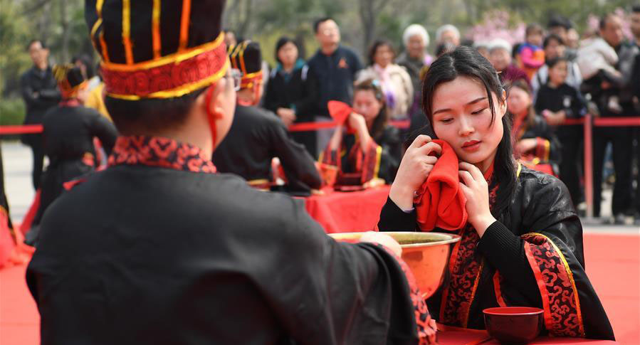 لقطة من زفاف جماعي يتبع العادات التقليدية في مدينة خفي حاضرة مقاطعة أنهوي في شرقي الصين، الذي تم يوم 30 مارس المنصرم.
